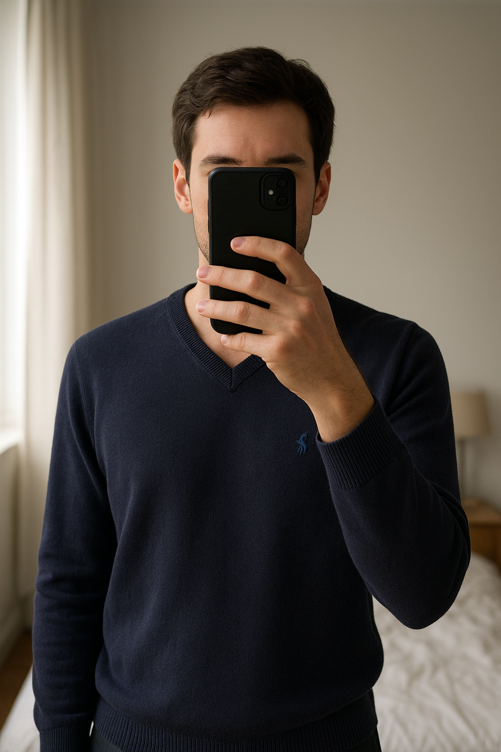 Pull col V Polo Ralph Lauren Homme Taille L debout, face à la caméra, dans une chambre à la lumière douce, avec une lumière naturelle filtrant par la fenêtre.