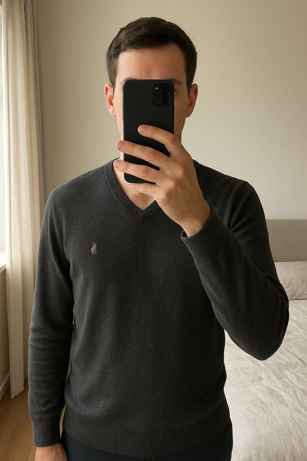 Pull Col V Polo Ralph Lauren Homme Taille XL debout, face à la caméra, dans une chambre à la lumière douce, avec une lumière naturelle filtrant par la fenêtre.