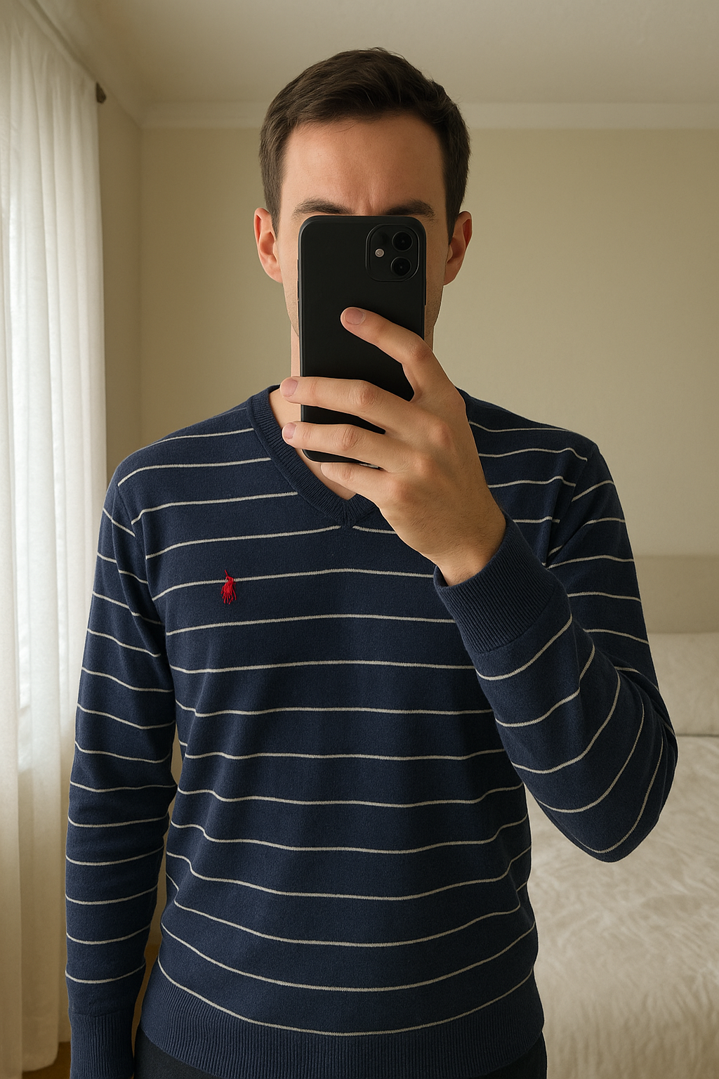 Pull Col V Polo Ralph Lauren Homme Taille XL debout, face à la caméra, dans une chambre à la lumière douce, avec une lumière naturelle filtrant par la fenêtre.