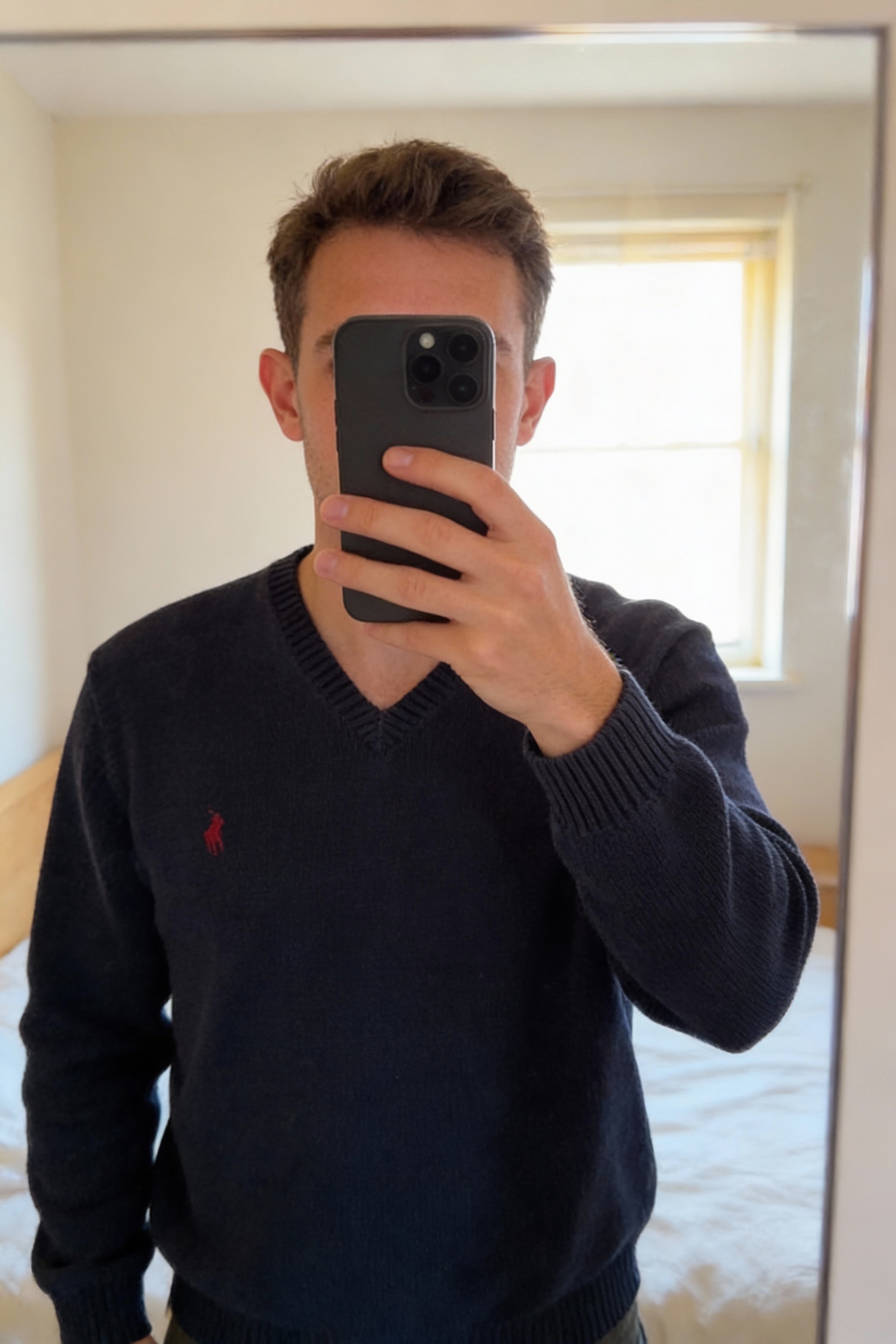 Pull col V Ralph Lauren marine logo rouge taille XL authentique debout, face à la caméra, dans une chambre à la lumière douce, avec une lumière naturelle filtrant par la fenêtre.