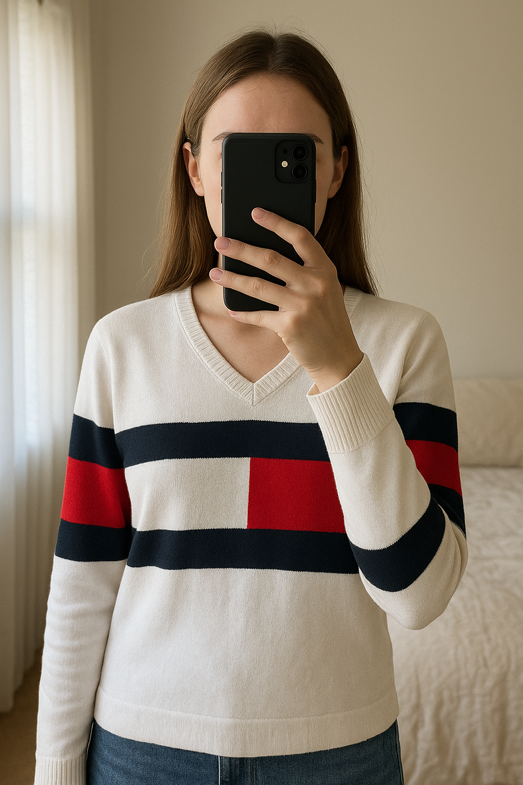 Pull col v Tommy Hilfiger debout, face à la caméra, dans une chambre à la lumière douce, avec une lumière naturelle filtrant par la fenêtre.