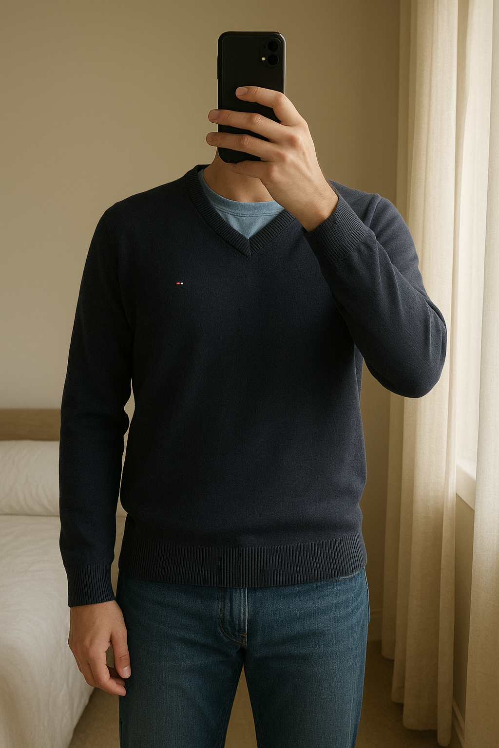 Pull Col V Tommy Hilfiger 100% Premium coton Bleu Marine M debout, face à la caméra, dans une chambre à la lumière douce, avec une lumière naturelle filtrant par la fenêtre.