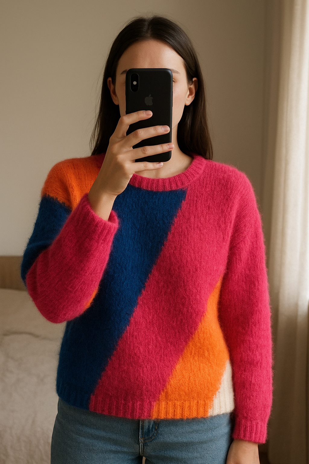 pull coloré debout, face à la caméra, dans une chambre à la lumière douce, avec une lumière naturelle filtrant par la fenêtre.