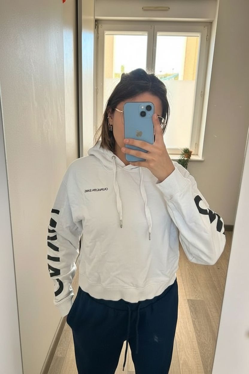 Pull court Calvin Klein debout, face à la caméra, dans une chambre à la lumière douce, avec une lumière naturelle filtrant par la fenêtre.