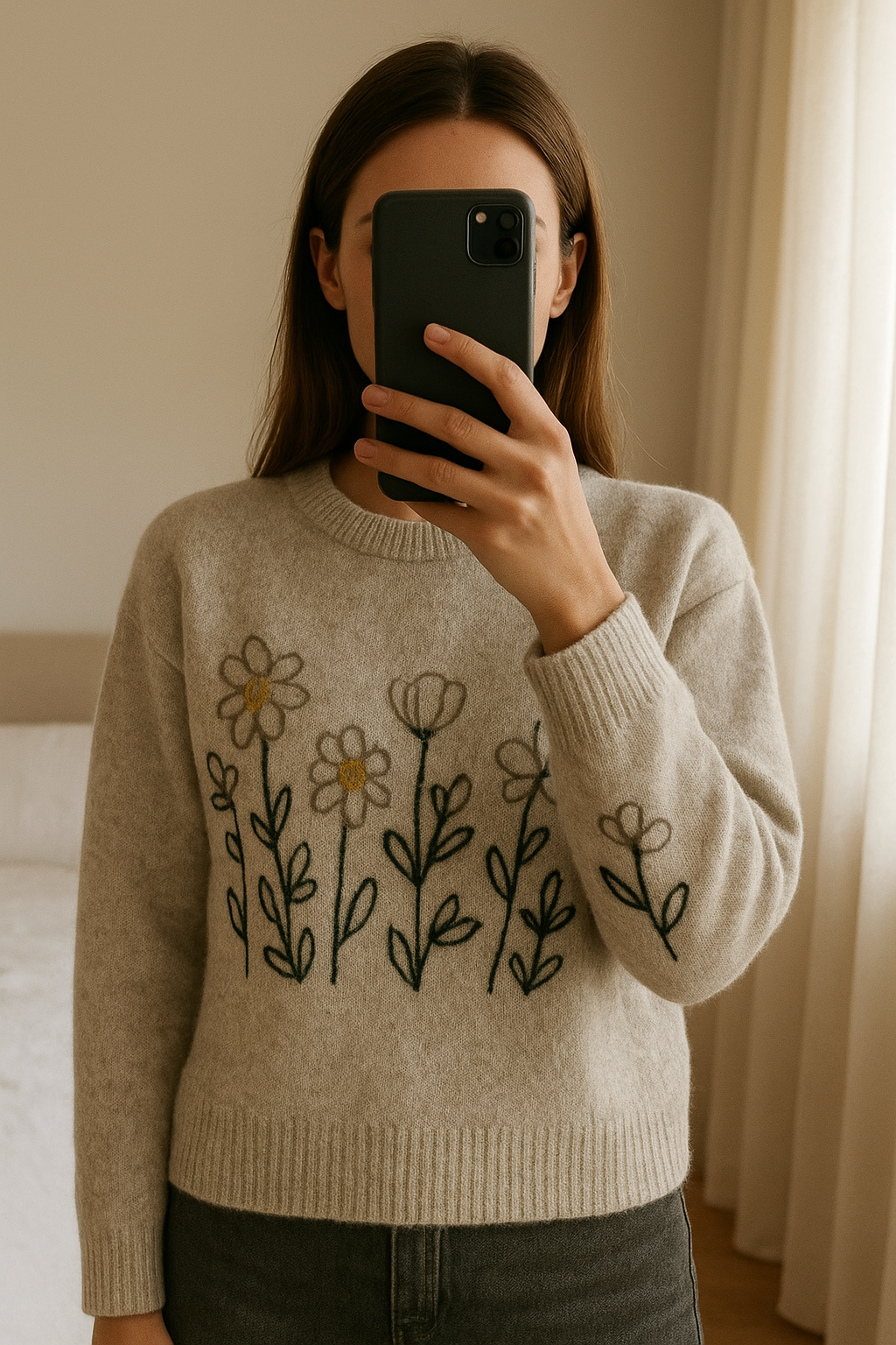 Pull crème brodé debout, face à la caméra, dans une chambre à la lumière douce, avec une lumière naturelle filtrant par la fenêtre.