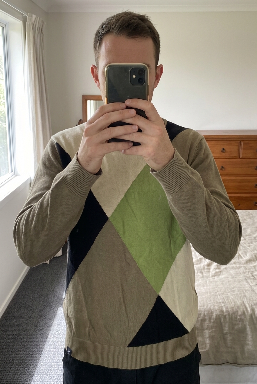 Pull Es col rond M debout, face à la caméra, dans une chambre à la lumière douce, avec une lumière naturelle filtrant par la fenêtre.
