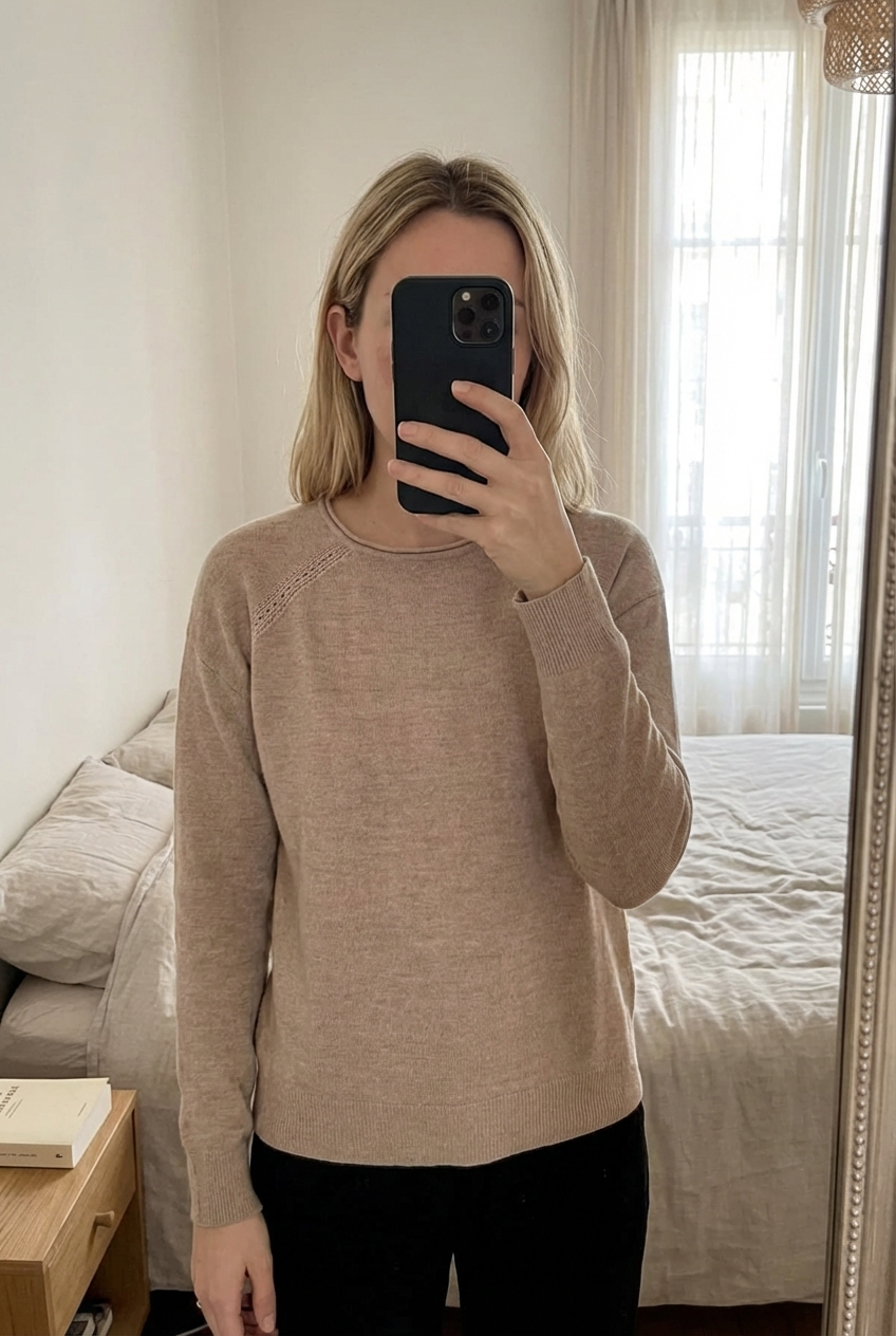 Pull femme gemo taille S debout, face à la caméra, dans une chambre à la lumière douce, avec une lumière naturelle filtrant par la fenêtre.