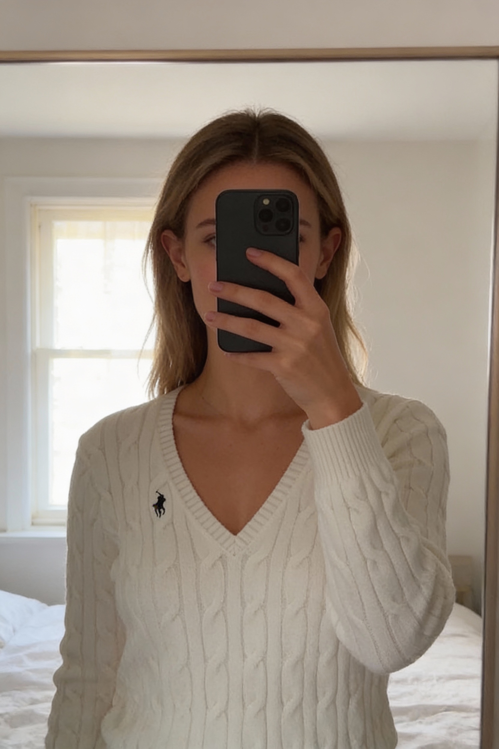 Pull femme Polo Ralph Lauren S blanc creme debout, face à la caméra, dans une chambre à la lumière douce, avec une lumière naturelle filtrant par la fenêtre.