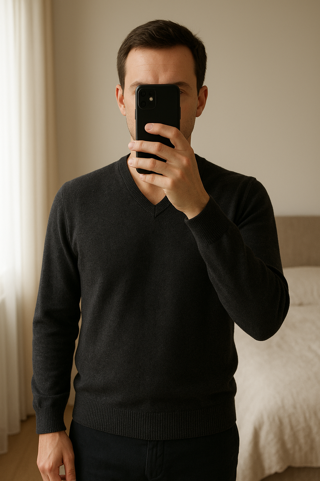 Pull Gant col V 100% laine gris foncé chiné debout, face à la caméra, dans une chambre à la lumière douce, avec une lumière naturelle filtrant par la fenêtre.