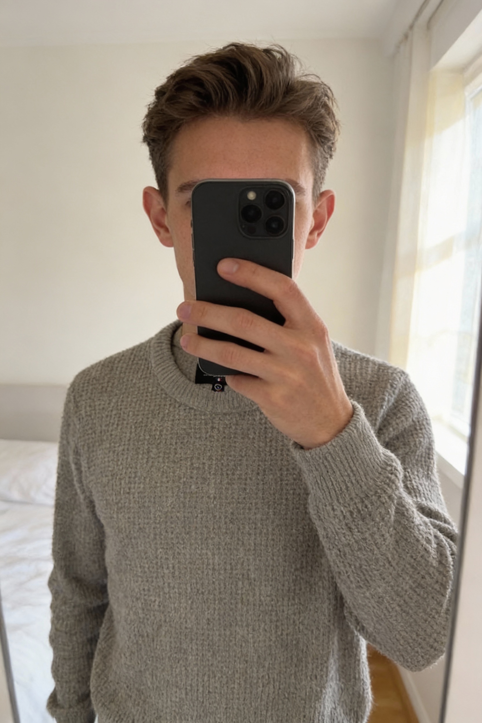 Pull gris en laine Hopaal debout, face à la caméra, dans une chambre à la lumière douce, avec une lumière naturelle filtrant par la fenêtre.