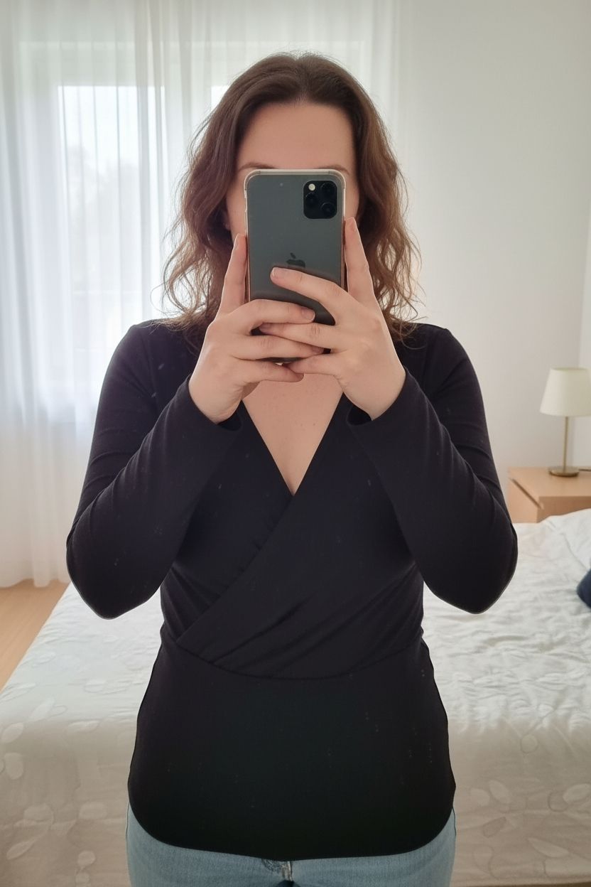 Une personne en Pull léger cache cœur debout, face à la caméra, avec une silhouette légèrement plus ronde, dans une chambre à la lumière douce, avec une lumière naturelle filtrant par la fenêtre.