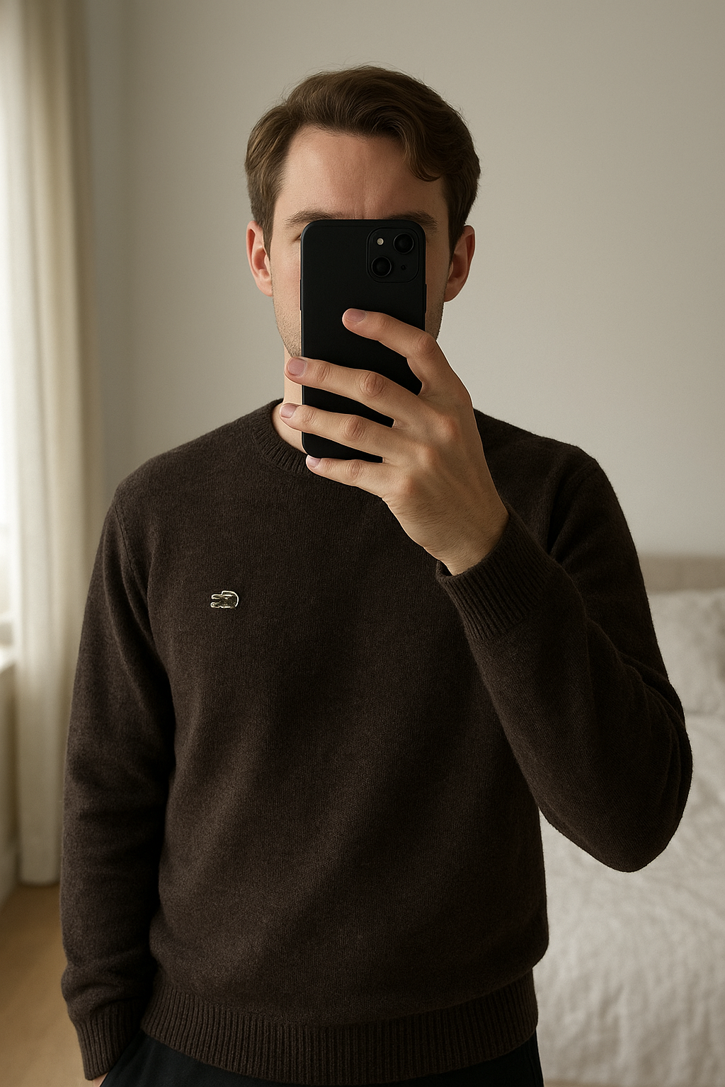Pull Lacoste Gris Laine Y2K Vintage S - Excellent État debout, face à la caméra, dans une chambre à la lumière douce, avec une lumière naturelle filtrant par la fenêtre.
