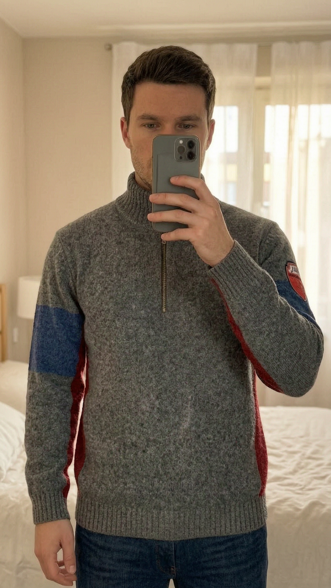 Une personne en Pull laine Tommy Hilfiger gris/bleu/rouge - Taille L (étiqueté XL) debout, face à la caméra, dans une chambre à la lumière douce, avec une lumière naturelle filtrant par la fenêtre.