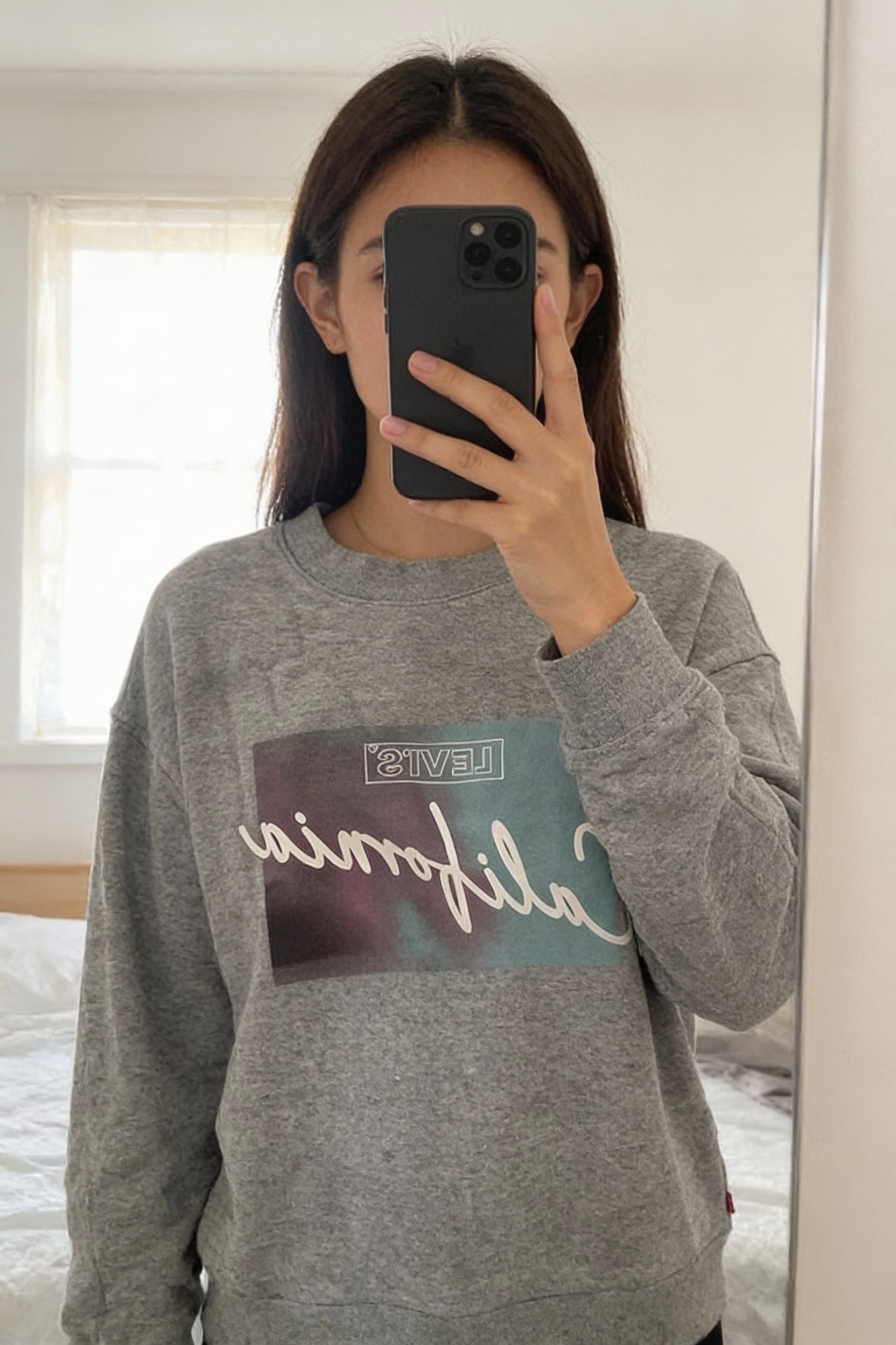Pull Levi’s taille S debout, face à la caméra, dans une chambre à la lumière douce, avec une lumière naturelle filtrant par la fenêtre.