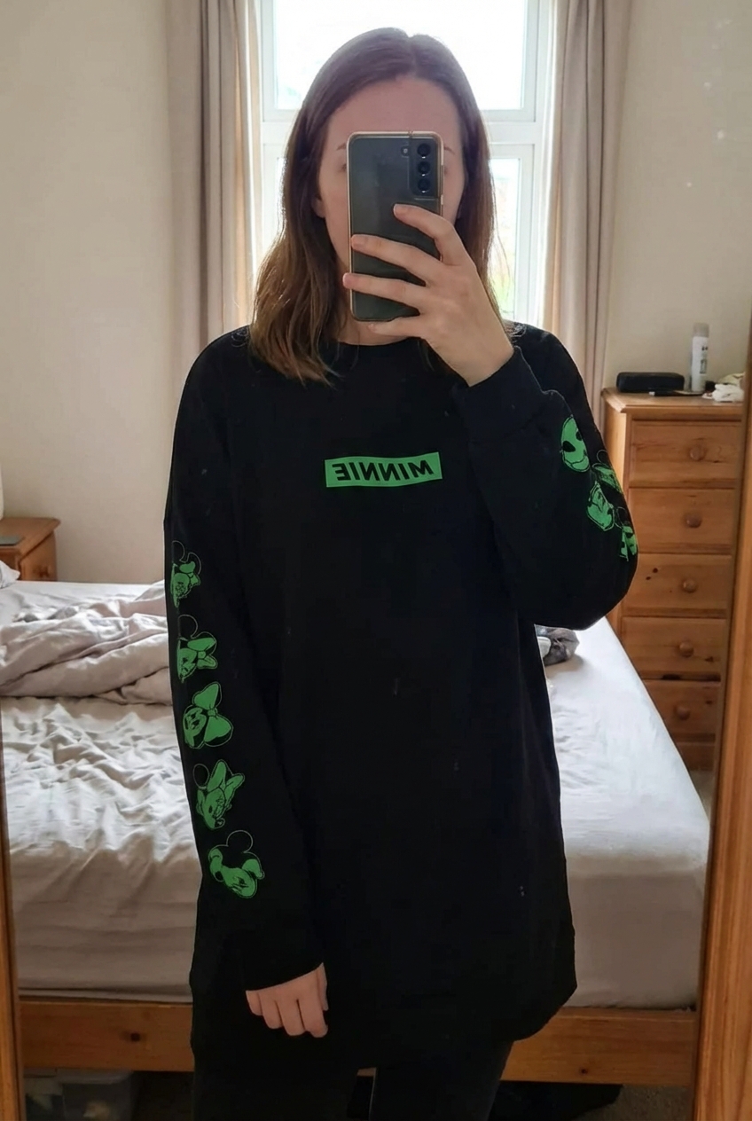 Pull long minnie taille 38 noir et vert debout, face à la caméra, dans une chambre à la lumière douce, avec une lumière naturelle filtrant par la fenêtre.