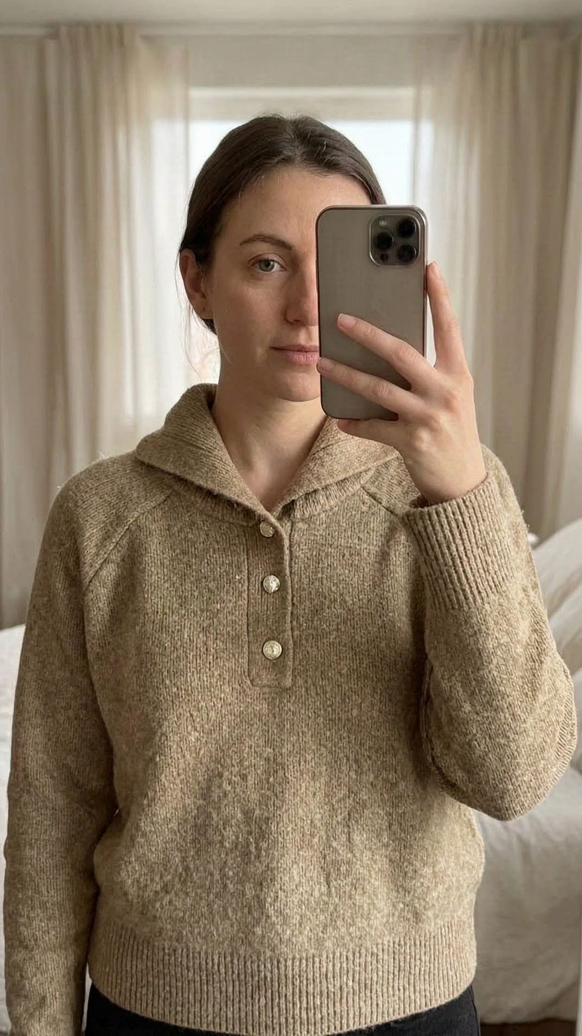 🤎 Pull marron à boutons dorés debout, face à la caméra, dans une chambre à la lumière douce, avec une lumière naturelle filtrant par la fenêtre.