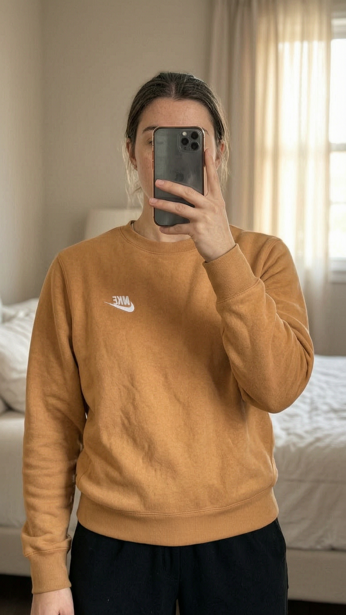 Pull Nike debout, face à la caméra, dans une chambre à la lumière douce, avec une lumière naturelle filtrant par la fenêtre.