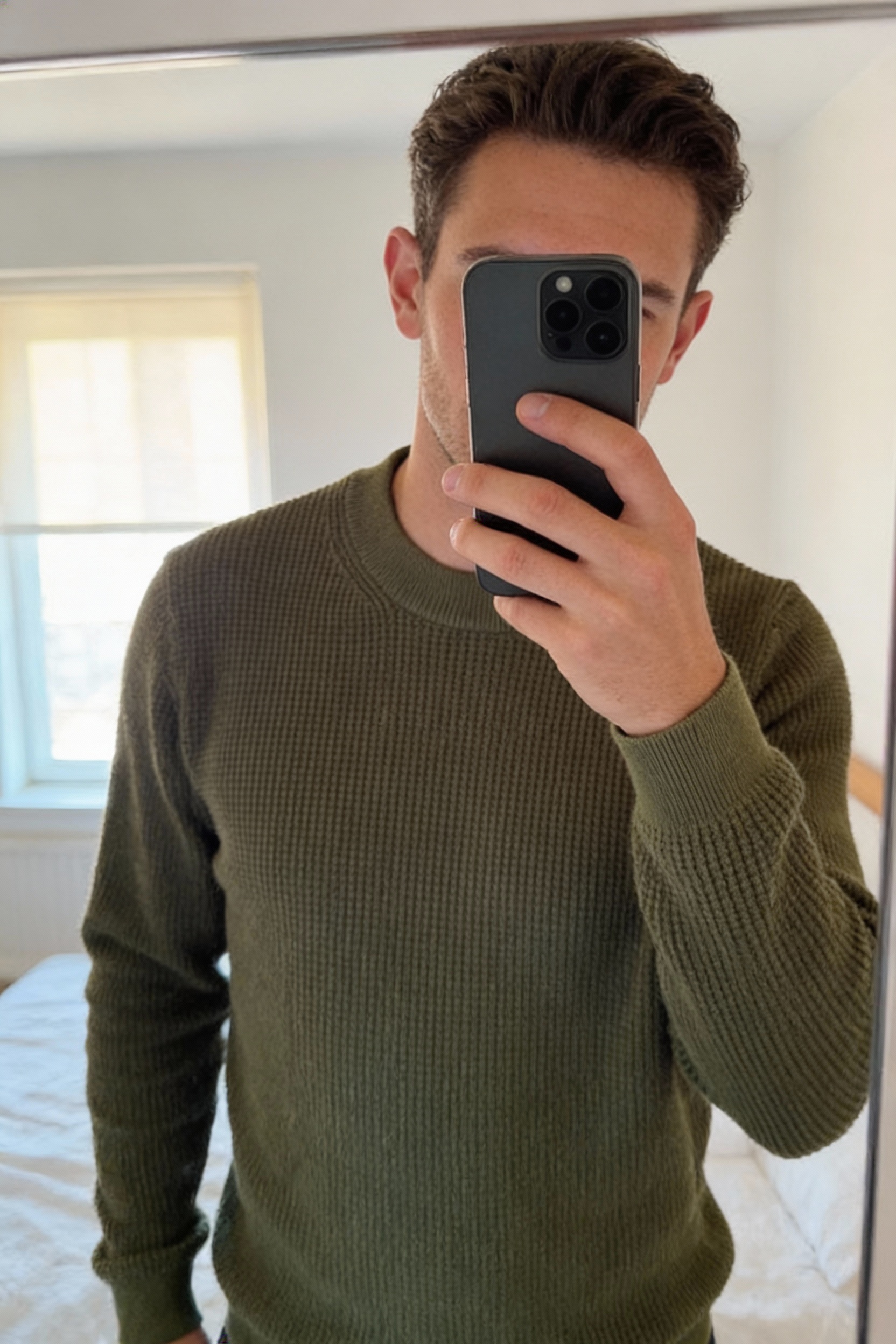 Pull over Mango Homme Vert Kaki S debout, face à la caméra, dans une chambre à la lumière douce, avec une lumière naturelle filtrant par la fenêtre.