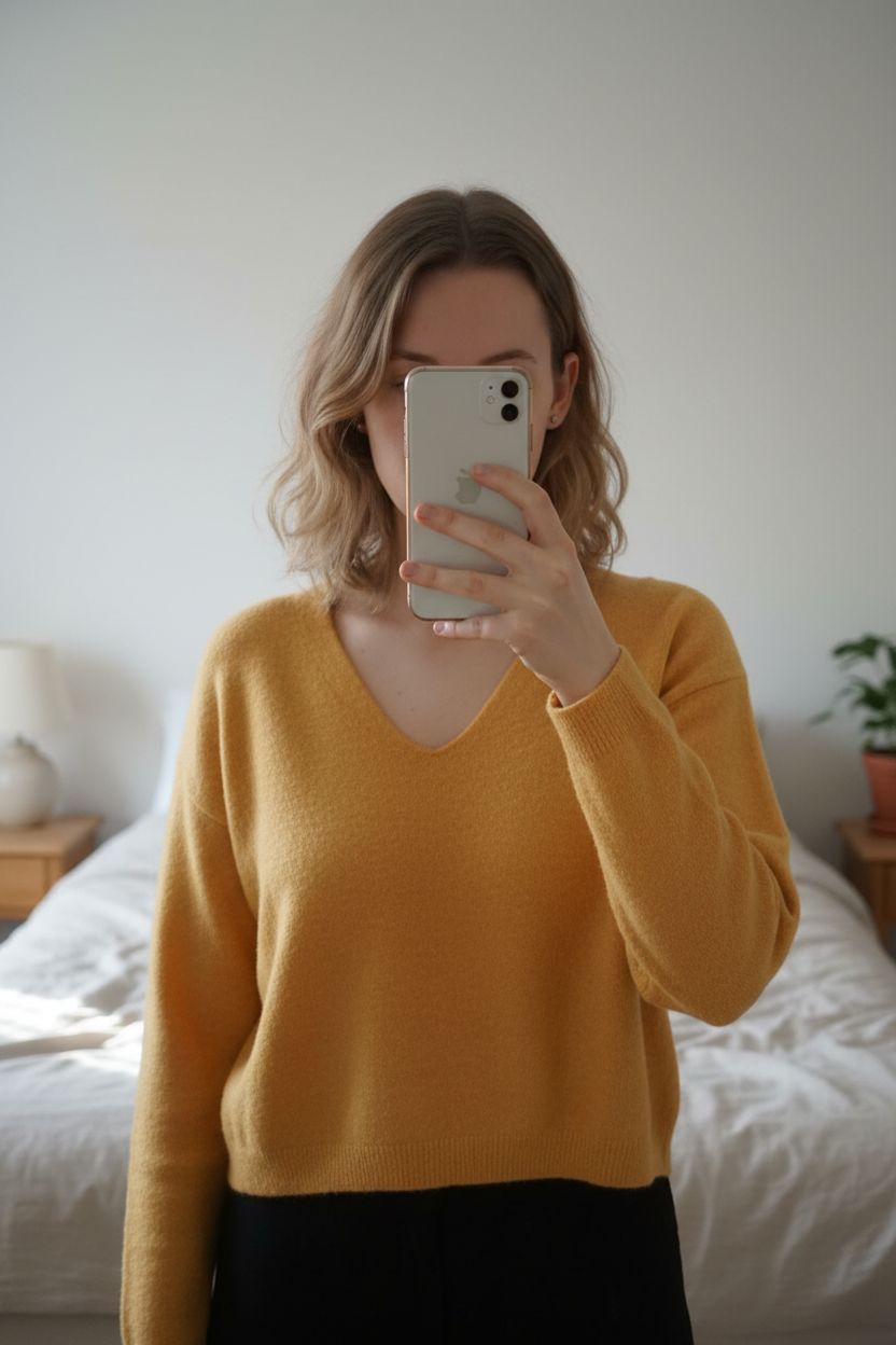 Pull oversized jaune moutarde col V H&M taille S M debout, face à la caméra, dans une chambre à la lumière douce, avec une lumière naturelle filtrant par la fenêtre.
