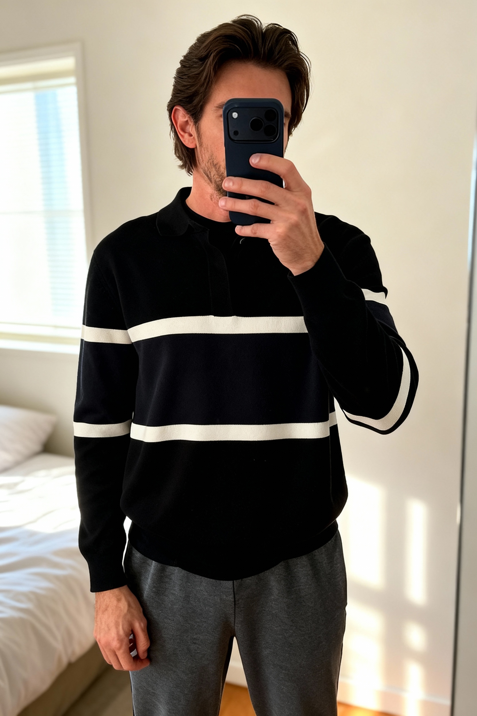 Pull polo cos debout, face à la caméra, dans une chambre à la lumière douce, avec une lumière naturelle filtrant par la fenêtre.