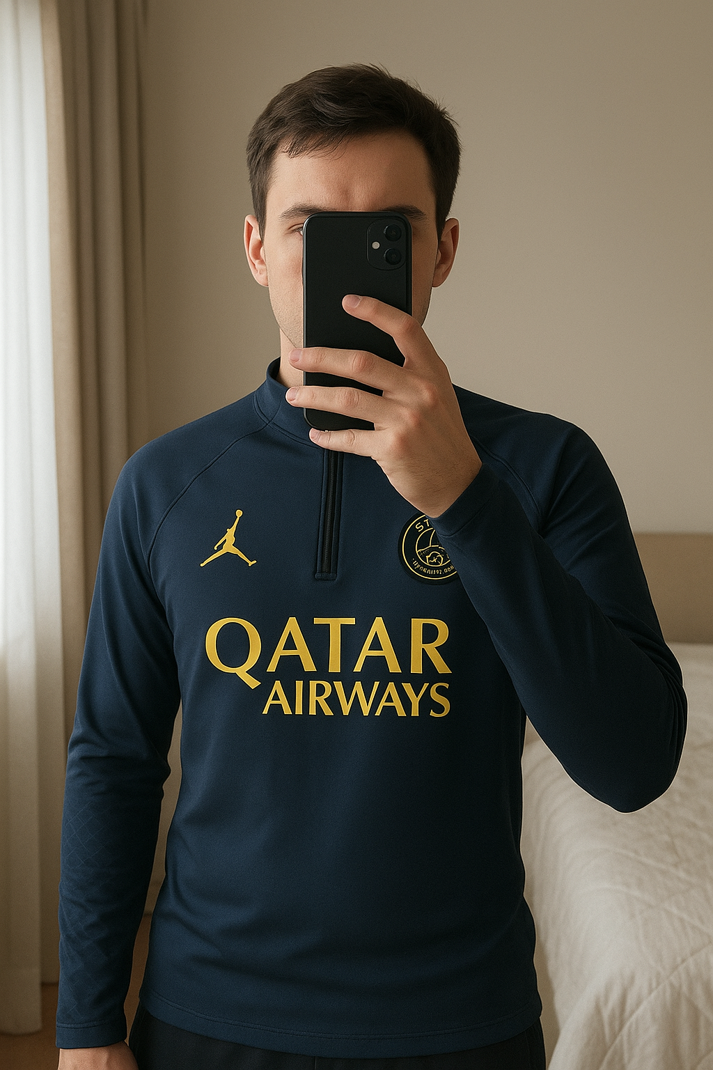 Pull PSG Jordan debout, face à la caméra, dans une chambre à la lumière douce, avec une lumière naturelle filtrant par la fenêtre.