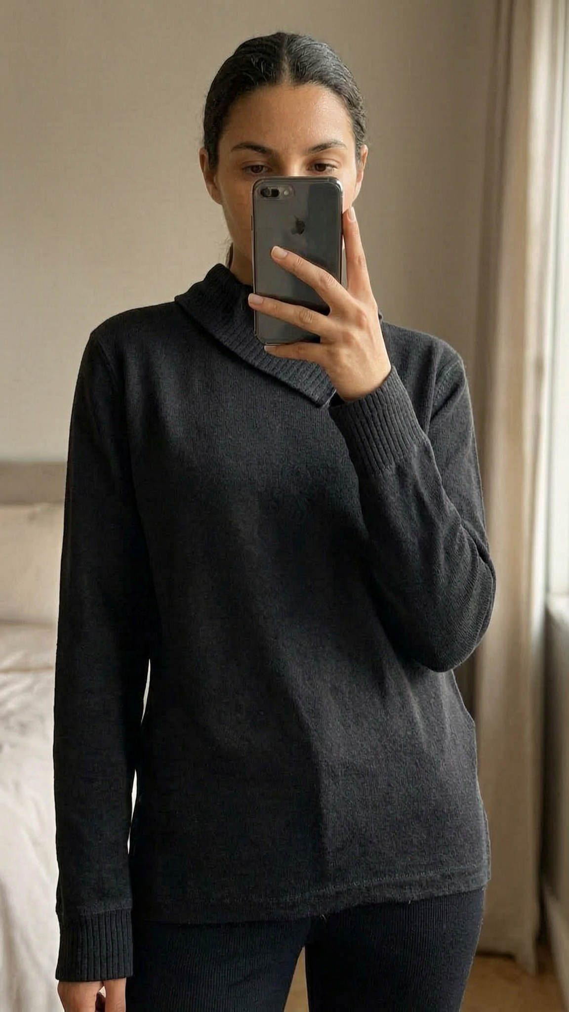Une personne en Pull Ralph Lauren debout, face à la caméra, dans une chambre à la lumière douce, avec une lumière naturelle filtrant par la fenêtre.