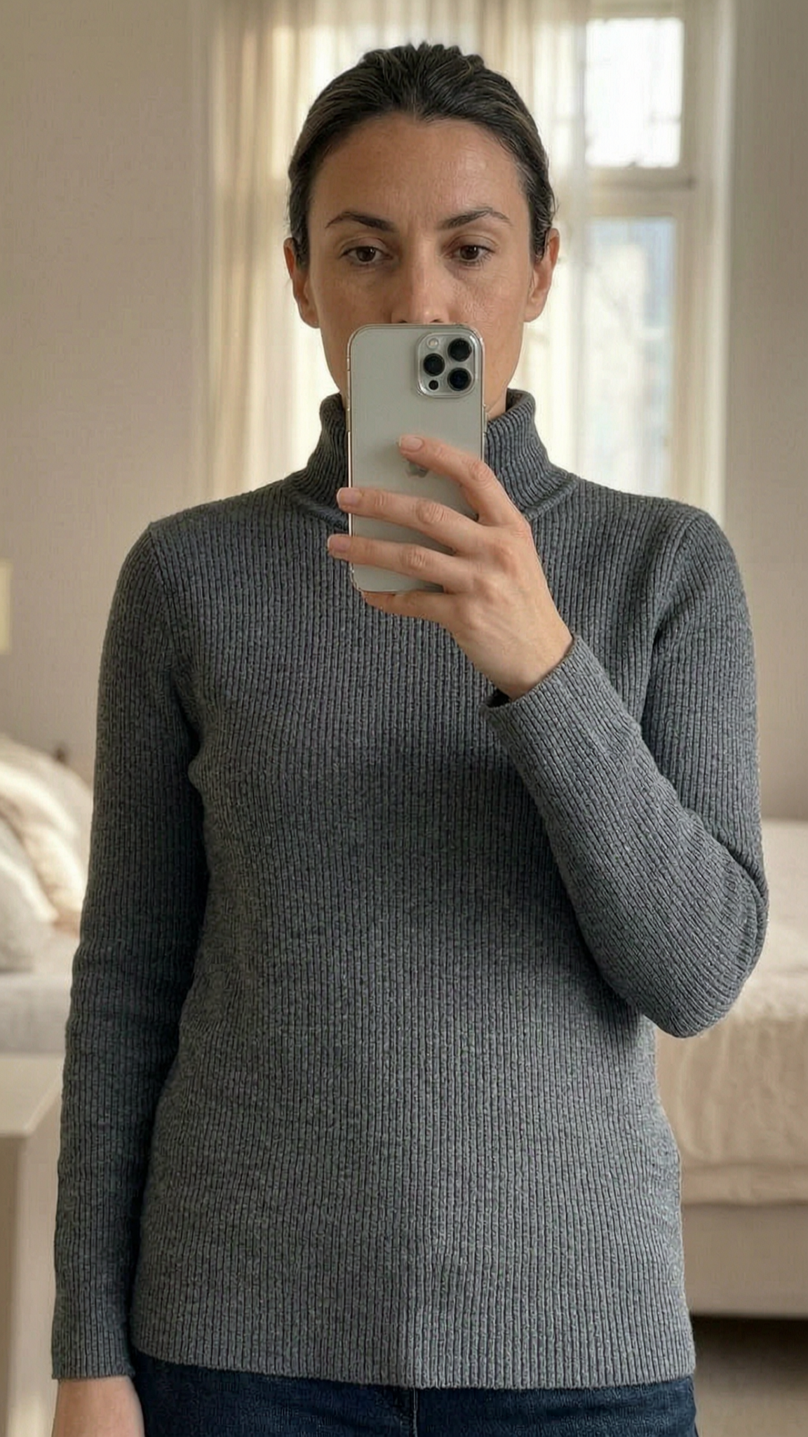Une personne en Pull ralph lauren debout, face à la caméra, dans une chambre à la lumière douce, avec une lumière naturelle filtrant par la fenêtre.