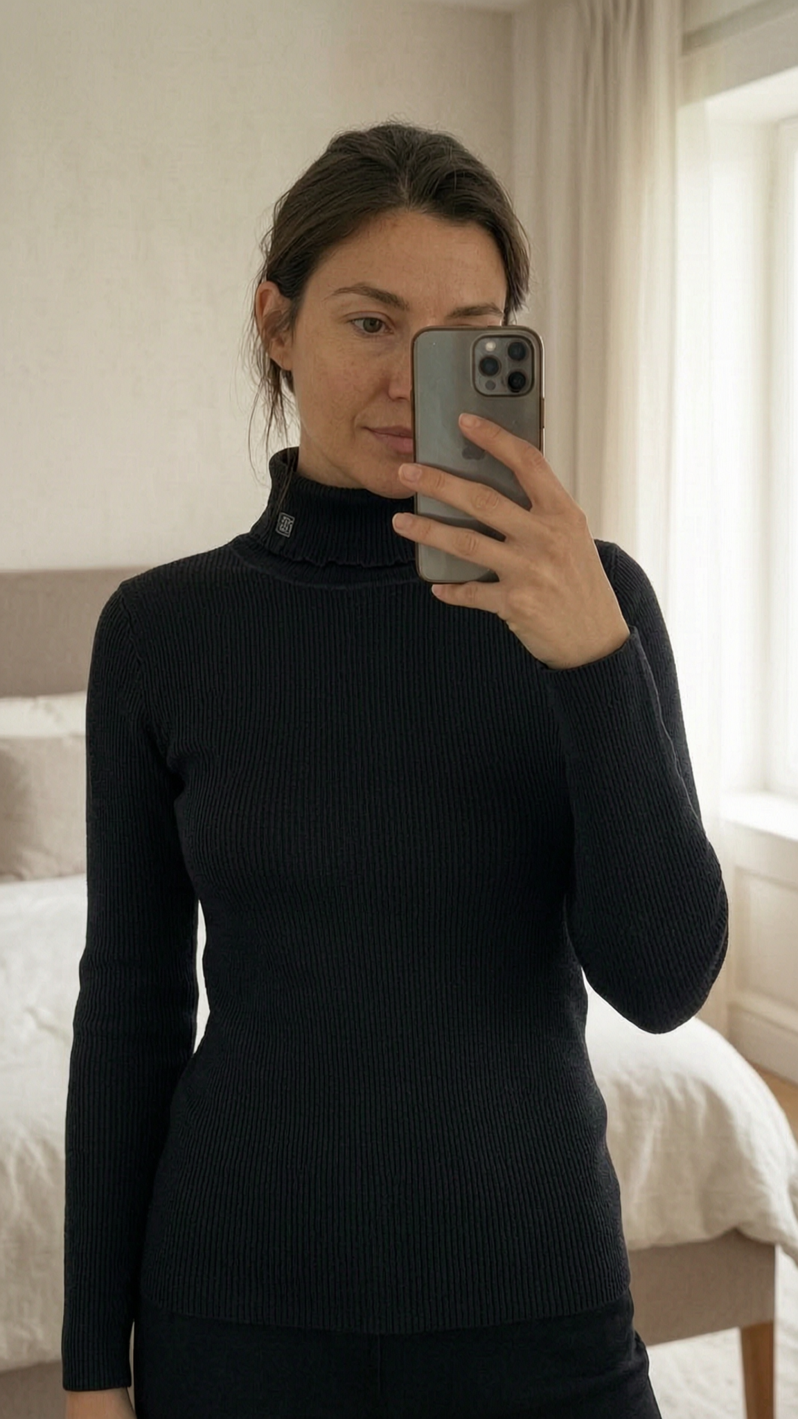 Une personne en Pull Ralph Lauren debout, face à la caméra, dans une chambre à la lumière douce, avec une lumière naturelle filtrant par la fenêtre.