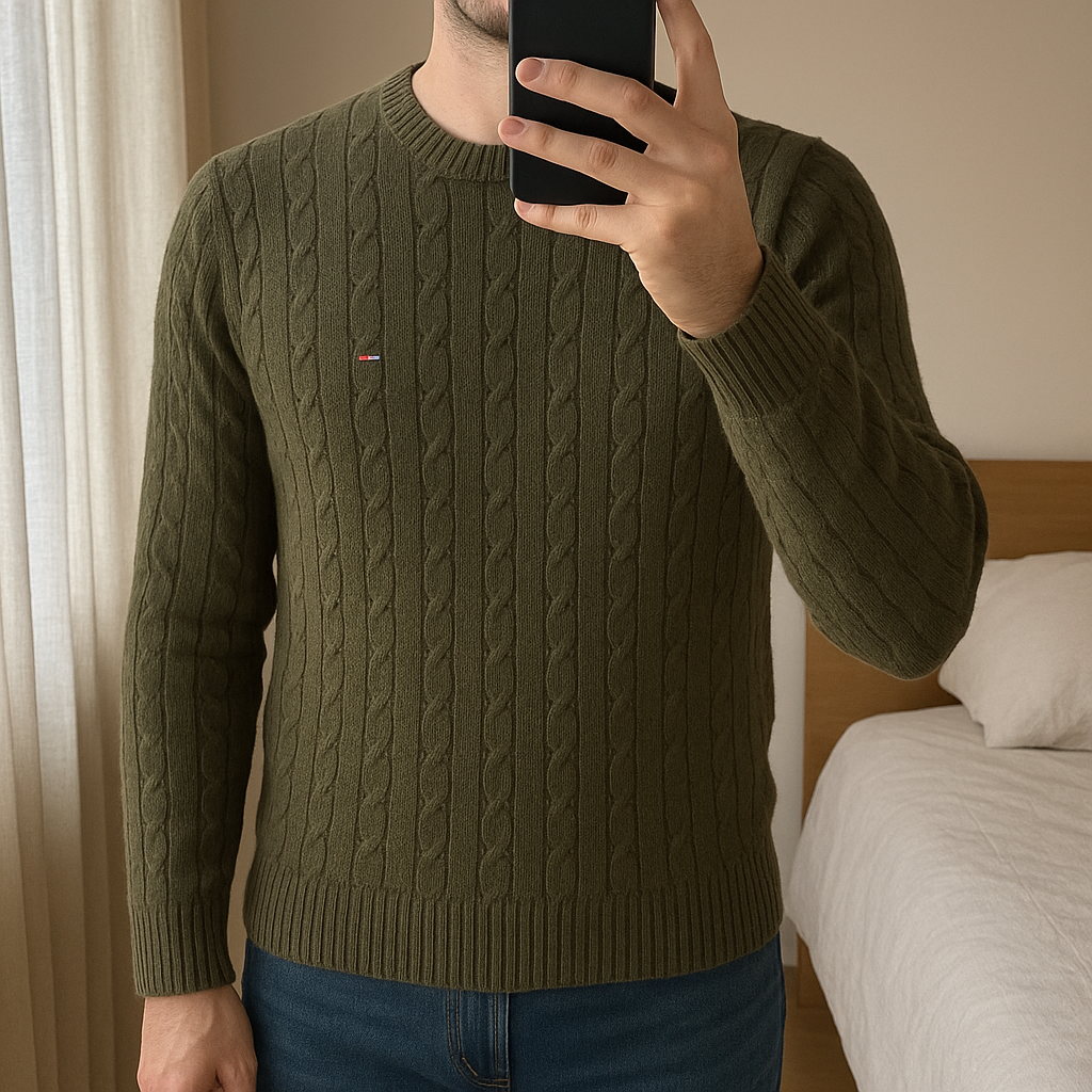 Pull ras de cou Tommy Hilfiger homme S – vert debout, face à la caméra, dans une chambre à la lumière douce, avec une lumière naturelle filtrant par la fenêtre.