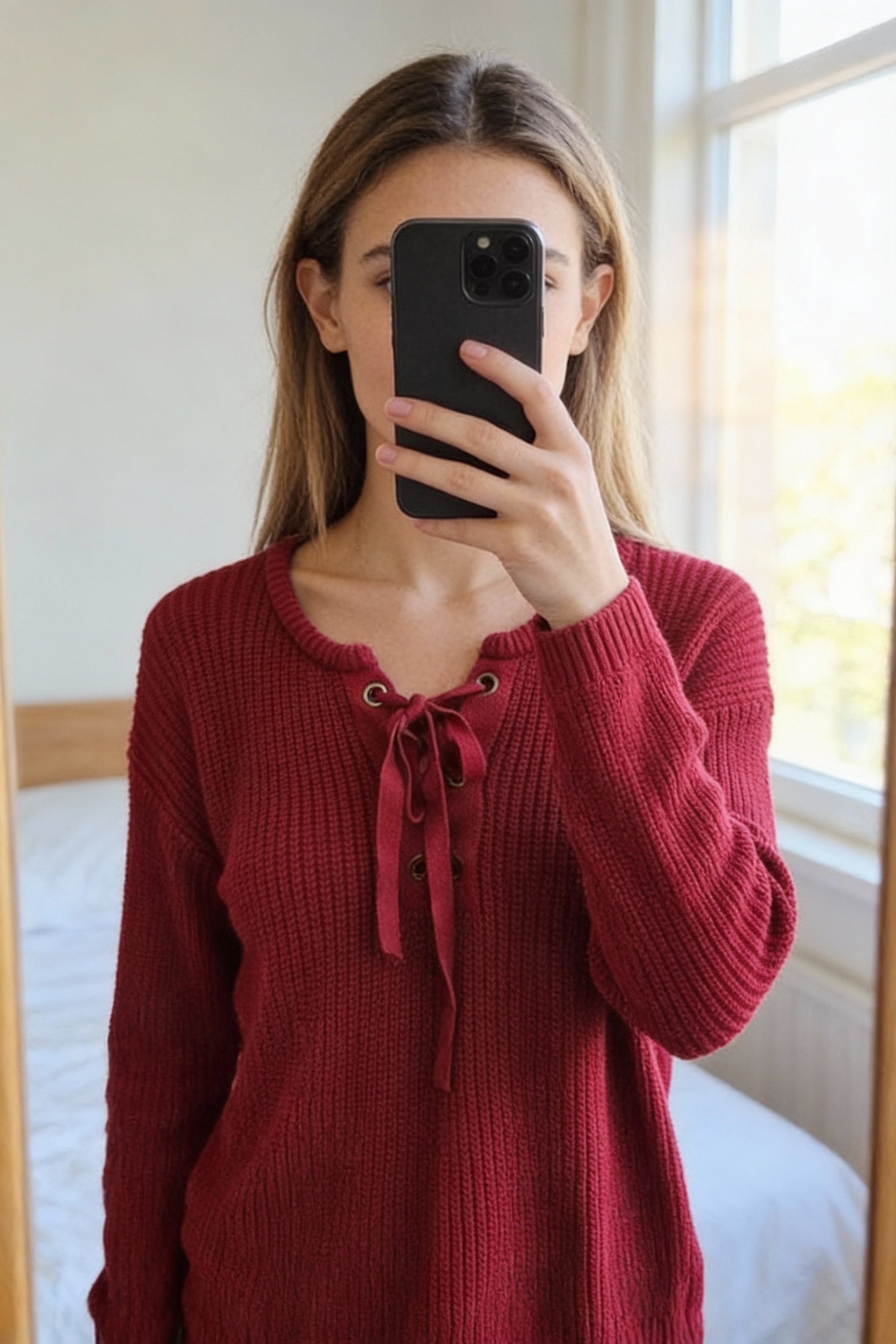 Pull rouge avec lacet à l'avant Pimkie debout, face à la caméra, dans une chambre à la lumière douce, avec une lumière naturelle filtrant par la fenêtre.
