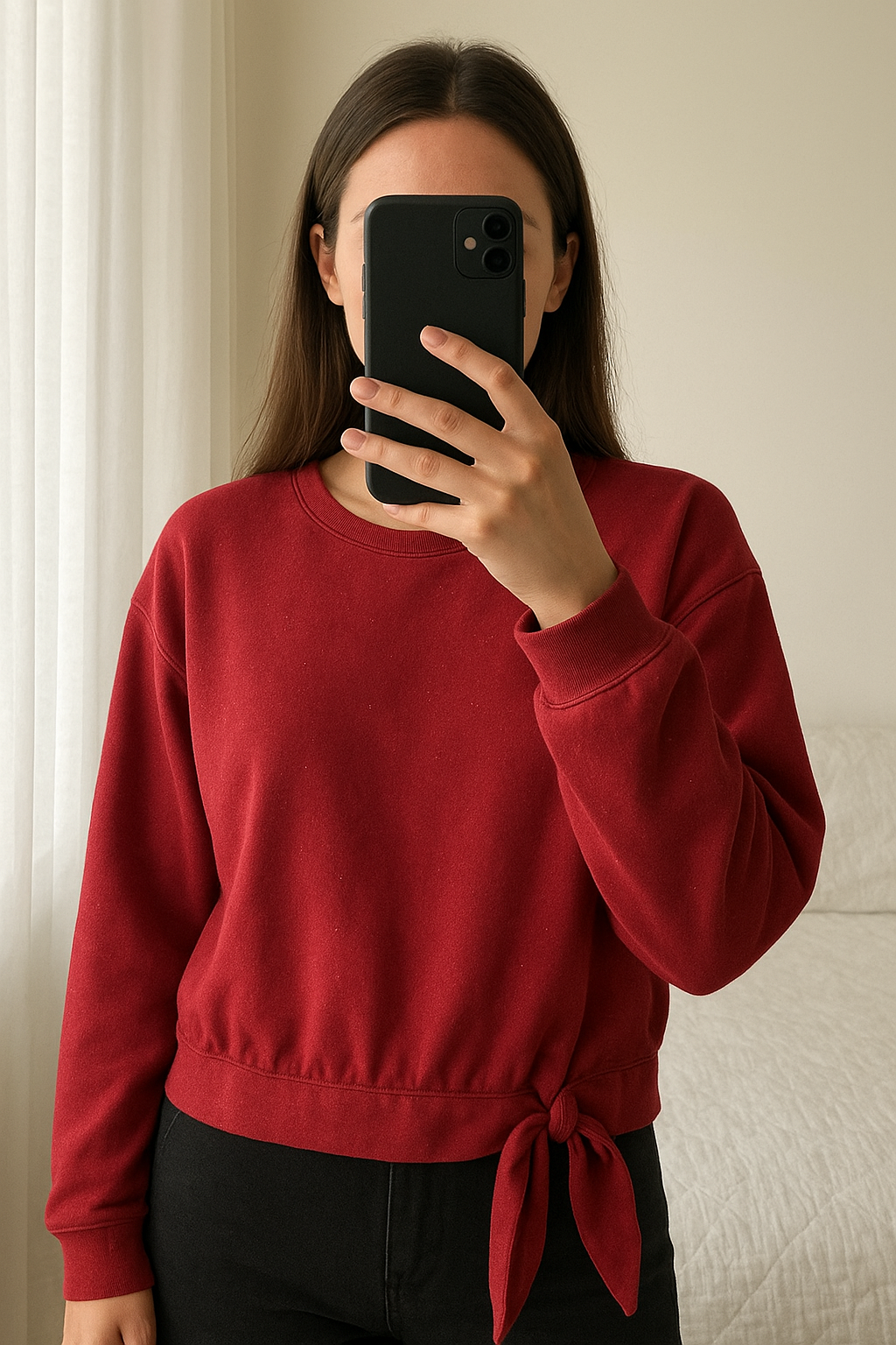 Pull Rouge Pailletté Camaïeu Taille L 💋 debout, face à la caméra, dans une chambre à la lumière douce, avec une lumière naturelle filtrant par la fenêtre.