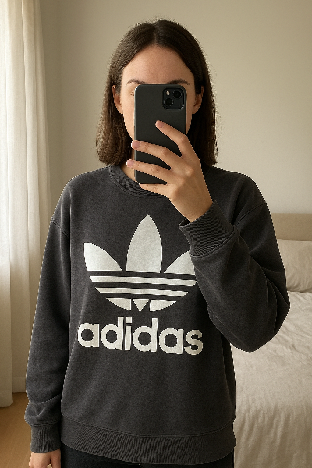 Pull sweat adidas - S - Noir - Très bon état debout, face à la caméra, dans une chambre à la lumière douce, avec une lumière naturelle filtrant par la fenêtre.