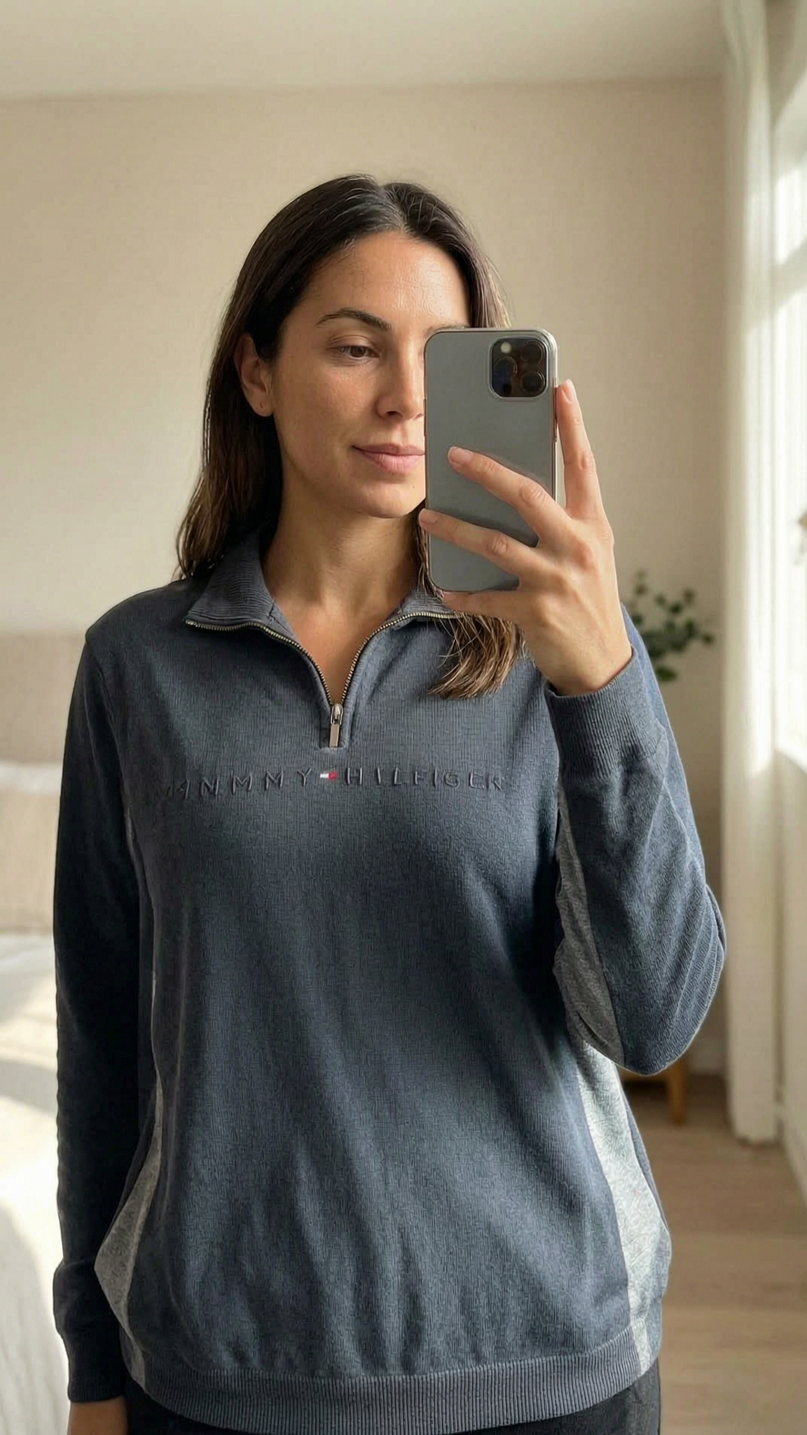 Une personne en Pull Tommy Hilfiger debout, face à la caméra, dans une chambre à la lumière douce, avec une lumière naturelle filtrant par la fenêtre.