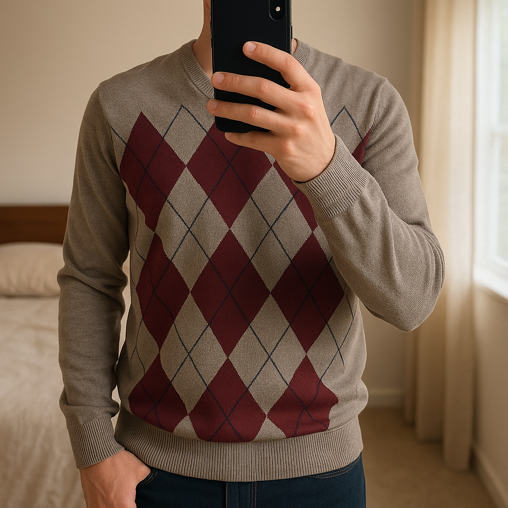 Pull Tommy Hilfiger Homme – Gris à carreaux – Taille M debout, face à la caméra, dans une chambre à la lumière douce, avec une lumière naturelle filtrant par la fenêtre.