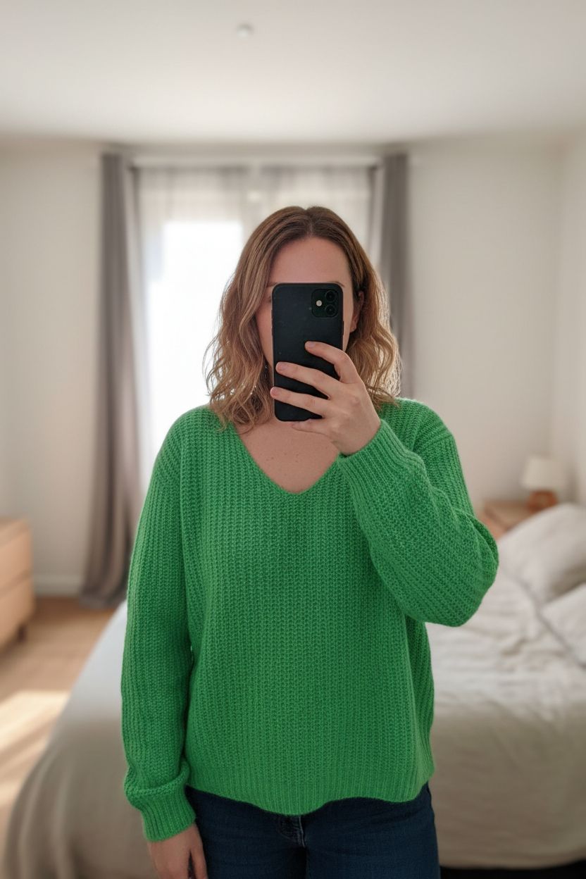 Une personne en Pull vert cache cache debout, face à la caméra, avec une silhouette légèrement plus ronde, dans une chambre à la lumière douce, avec une lumière naturelle filtrant par la fenêtre.