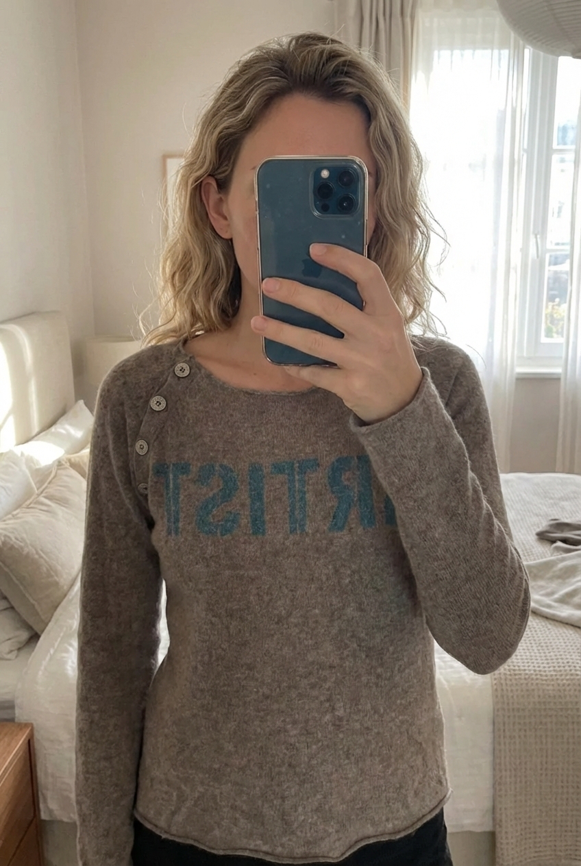 Pulpe cachemire « artist » debout, face à la caméra, dans une chambre à la lumière douce, avec une lumière naturelle filtrant par la fenêtre.