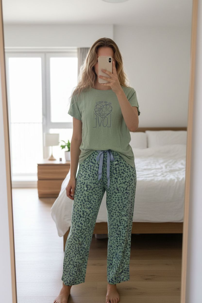 Pyjama été vert menthe taille S 36/38 debout, face à la caméra, dans une chambre à la lumière douce, avec une lumière naturelle filtrant par la fenêtre.