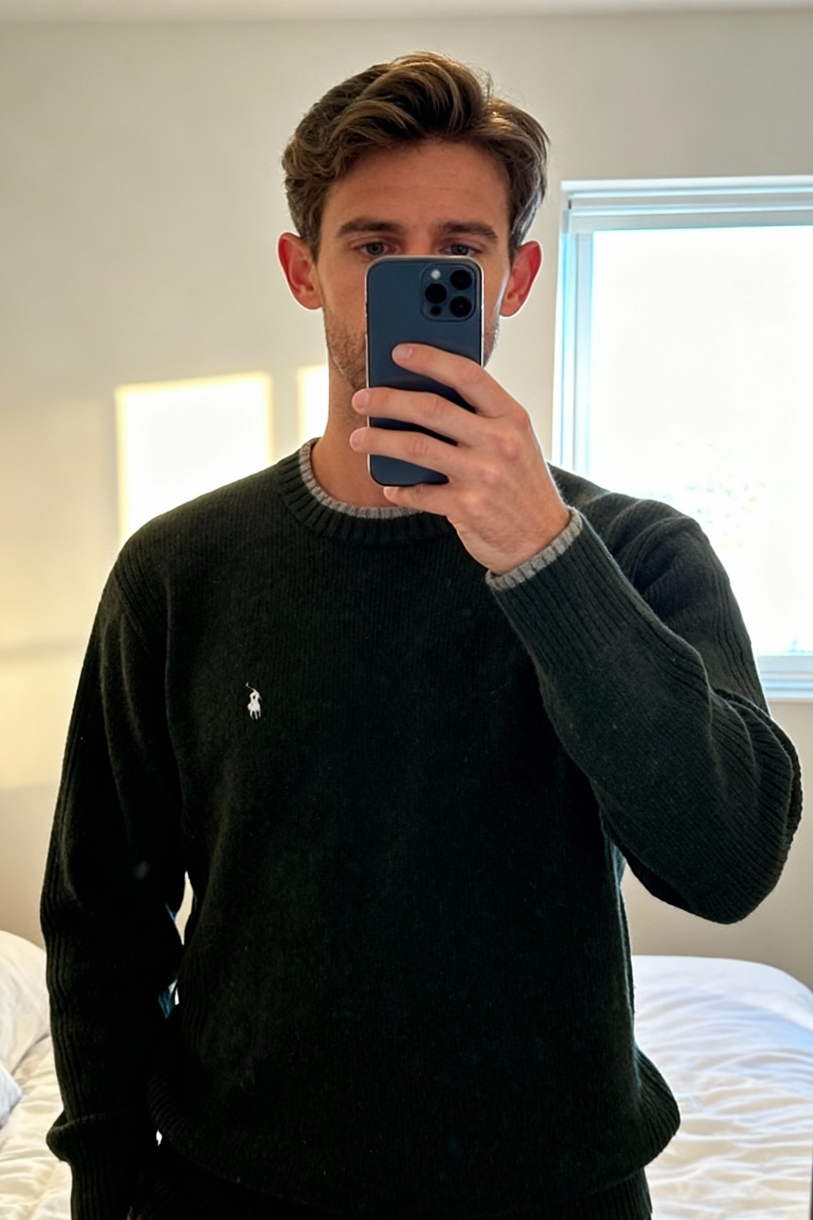 Ralph Lauren - Pull en laine debout, face à la caméra, dans une chambre à la lumière douce, avec une lumière naturelle filtrant par la fenêtre.