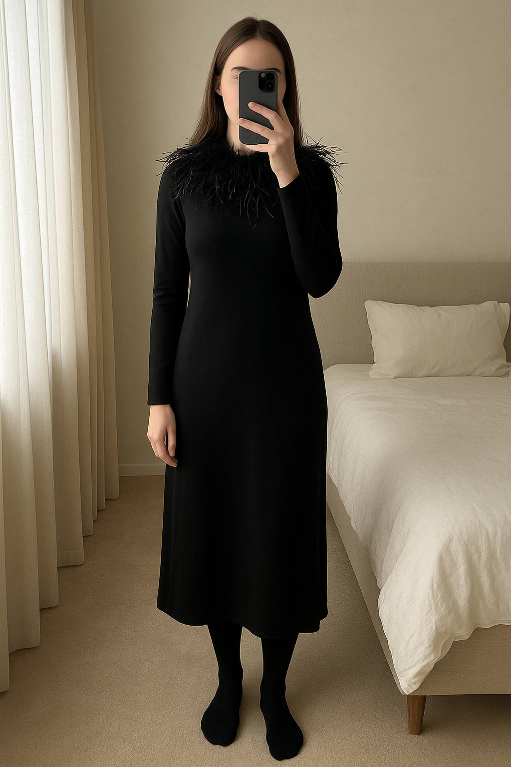 Ralph Lauren Schwarzes Kleid mit Federn aus 58% Merinowolle (M) aufrecht stehend, der Kamera zugewandt, in einem sanft beleuchteten Schlafzimmer, mit natürlichem Licht, das durch ein Fenster fällt.