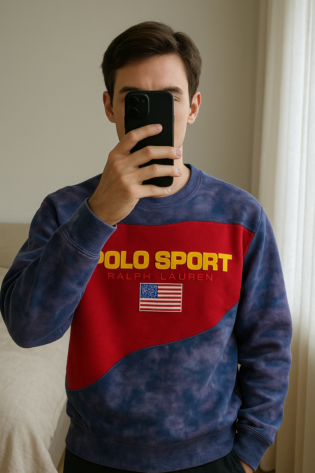 Ralph Lauren Sport Crewneck USA Flag | Rouge/Cloudy Purple | taille S debout, face à la caméra, dans une chambre à la lumière douce, avec une lumière naturelle filtrant par la fenêtre.