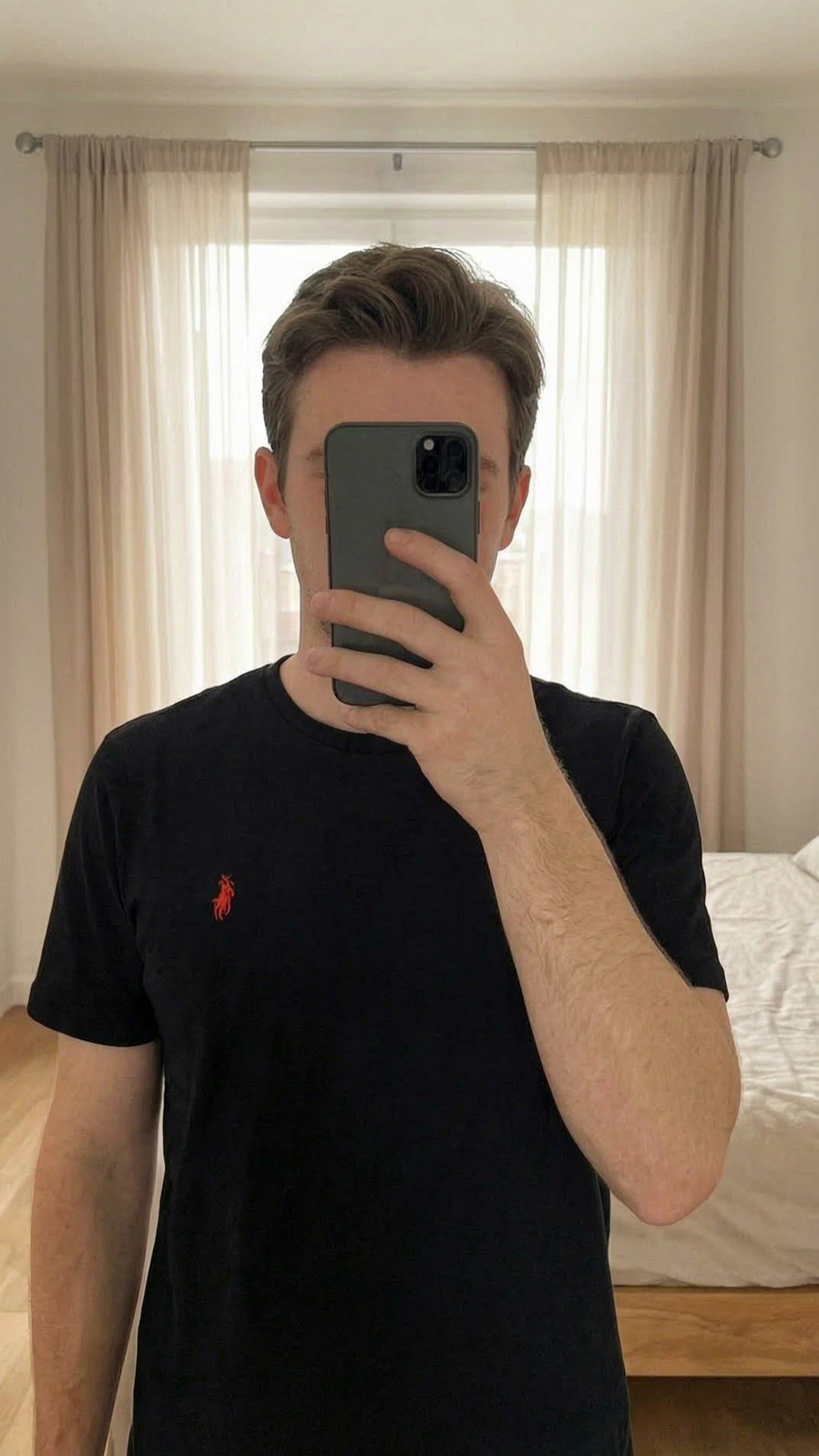 Ralph Lauren T-shirt aufrecht stehend, der Kamera zugewandt, in einem sanft beleuchteten Schlafzimmer, mit natürlichem Licht, das durch ein Fenster fällt.