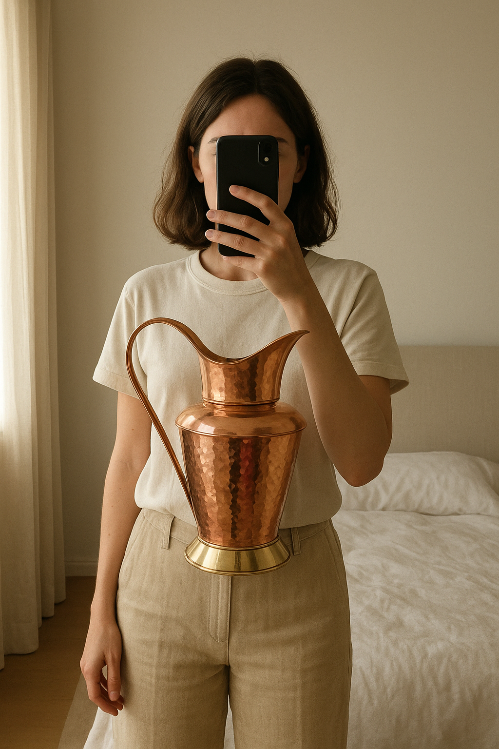Rare Pichet en Cuivre Prix Négociable ! debout, face à la caméra, dans une chambre à la lumière douce, avec une lumière naturelle filtrant par la fenêtre.
