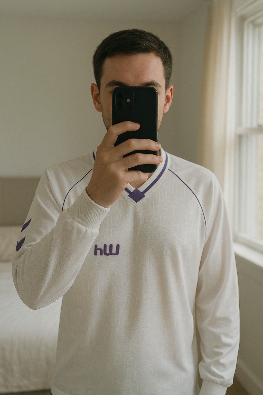 Real Madrid Vintage Hummel – Talla S – Nueva – Edición Especial Vintage treasure debout, face à la caméra, dans une chambre à la lumière douce, avec une lumière naturelle filtrant par la fenêtre.