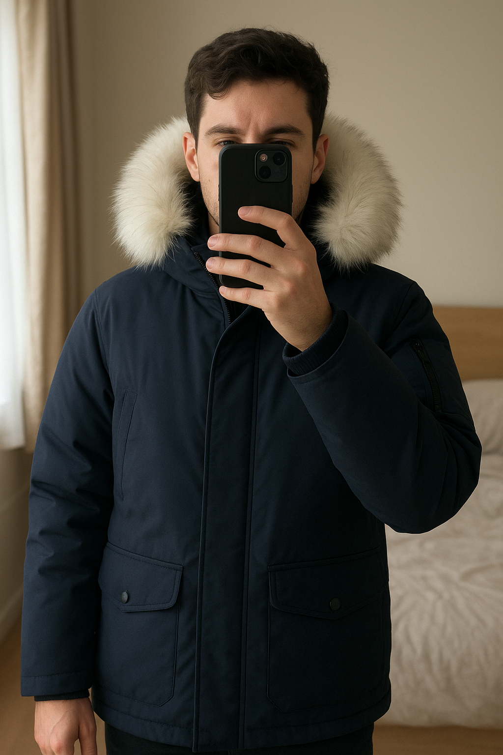 Redskins • Parkas Bleu Marine debout, face à la caméra, dans une chambre à la lumière douce, avec une lumière naturelle filtrant par la fenêtre.
