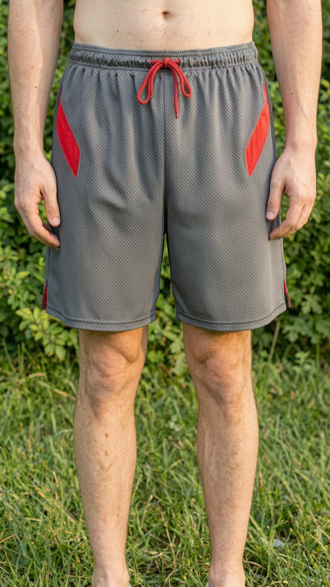 Une personne en Reebok short gris/rouge taille L/G debout, face à la caméra, en extérieur, dans un cadre naturel entouré de verdure et de lumière douce.