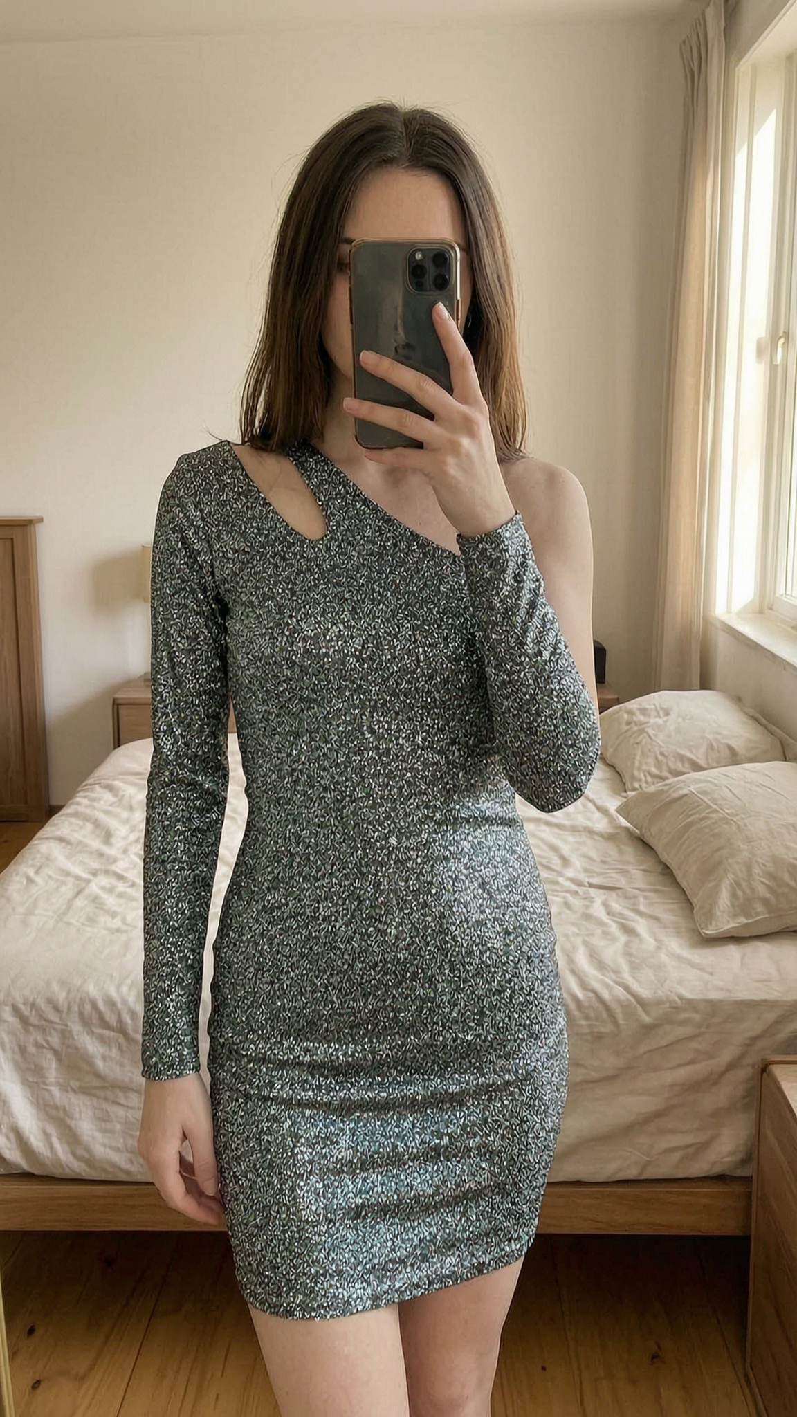 Robe asymétrique argentée taille 36 debout, face à la caméra, dans une chambre à la lumière douce, avec une lumière naturelle filtrant par la fenêtre.