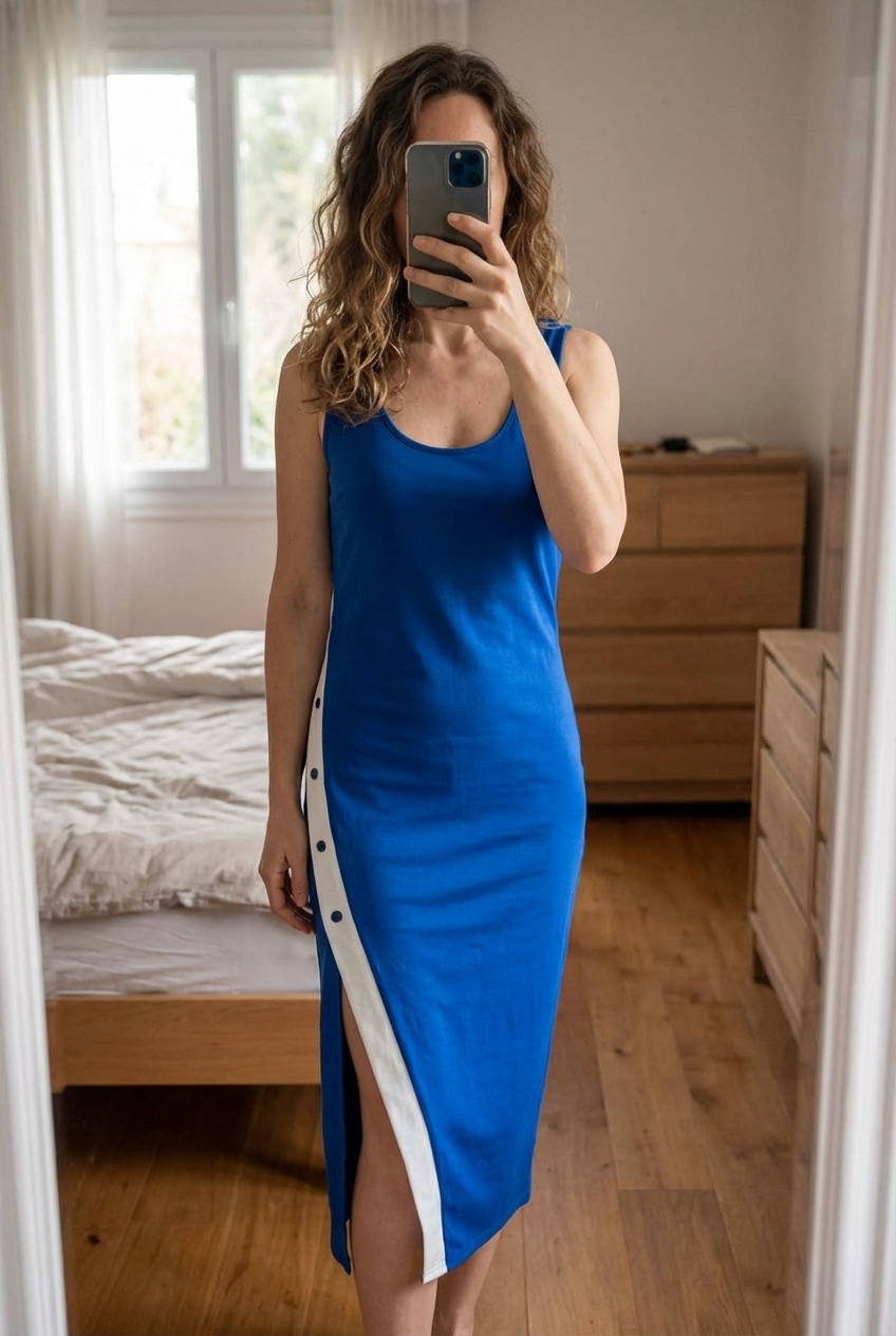 Robe bleu royal sportive shein taille 44 debout, face à la caméra, dans une chambre à la lumière douce, avec une lumière naturelle filtrant par la fenêtre.