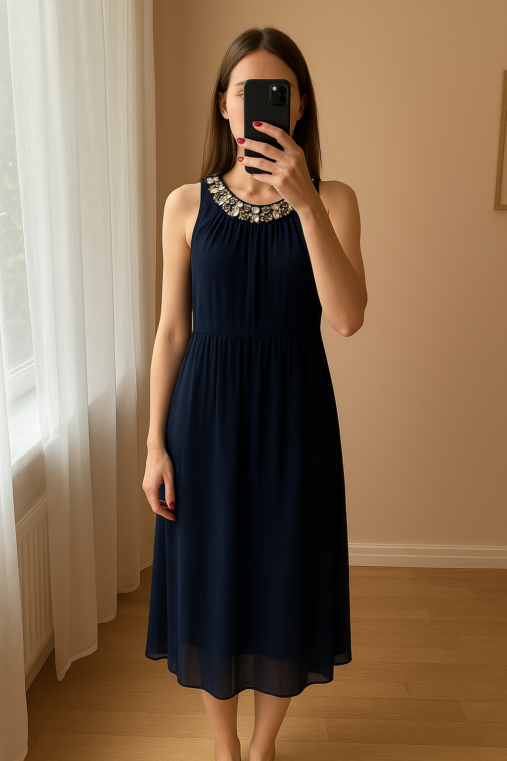 Robe bleue cocktail et soirée taille M debout, face à la caméra, dans une chambre à la lumière douce, avec une lumière naturelle filtrant par la fenêtre.