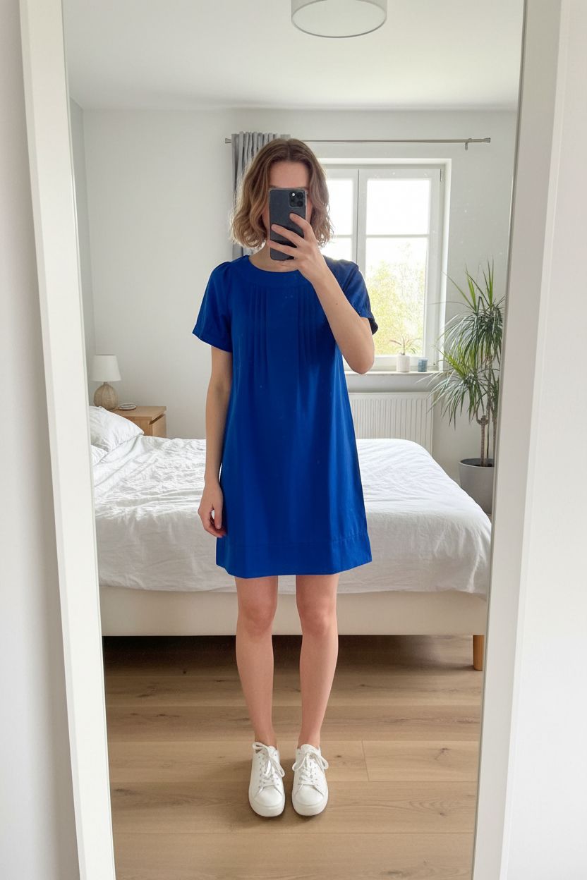 Robe bleue nuit debout, face à la caméra, dans une chambre à la lumière douce, avec une lumière naturelle filtrant par la fenêtre.