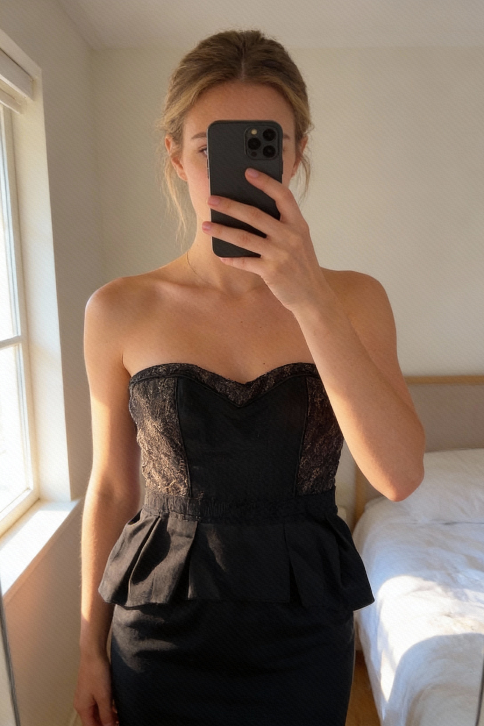 Robe bustier BCBG Max Azria debout, face à la caméra, dans une chambre à la lumière douce, avec une lumière naturelle filtrant par la fenêtre.